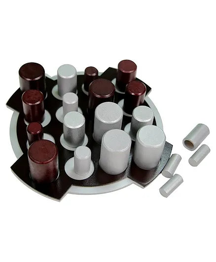 Your memory is tested as you try to remember which color one of your larger pieces is covering before you move it. As soon as a player has four like-colored pieces in a row, he wins — except in one case: If you lift your piece and reveal an opponent's piece that finishes a four-in-a-row, you don't immediately lose; you can't return the piece to its starting location, but if you can place it over one of the opponent's three other pieces in that row, the game continues.