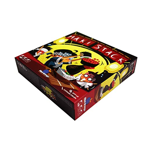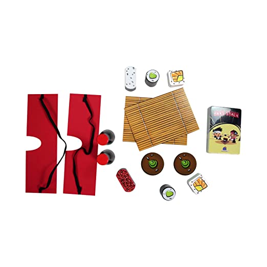 Order up- It's time for a sushi showdown! Put on your mask and grab your teammate, or prepare to use your fingers as chopsticks. Balance and arrange the sushi, plates, and soy sauce bottles, and make sure to execute the order exactly as shown on the card. But be careful; one wrong move and everything might tumble over! Race a friend or challenge as a team in this sushi stacking extravaganza. High-quality wooden pieces and crazy stacking combinations make Maki Stack perfect for a game night full of fun and laughs.
