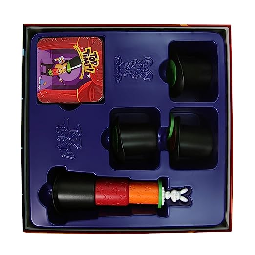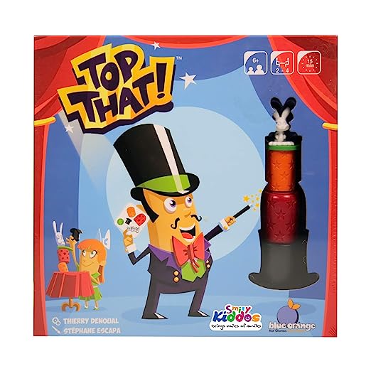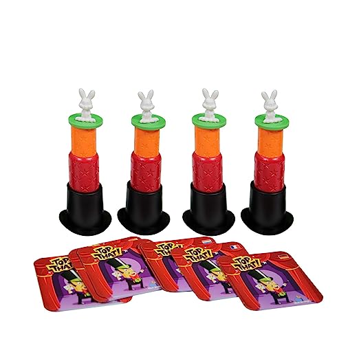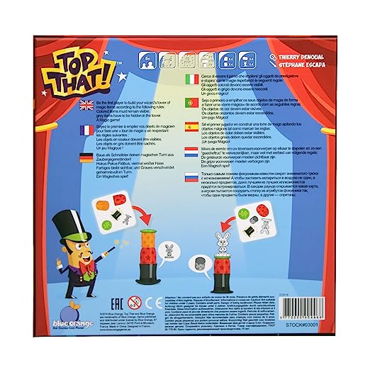 Put on your hat, break out your props, and hide your rabbits in this magical match-up! When the challenge card is flipped over, players race to stack their objects in 1 single pile following 3 simple rules: objects printed in colour must be visible on the stack, objects printed in grey must be hidden inside objects on the stack, and objects surrounded by stars must be kept empty.