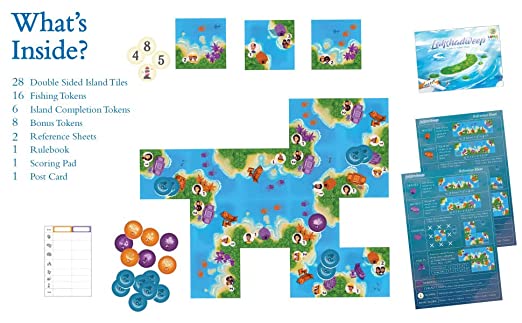 In the game of Lakshadweep, two players build the exotic islands of Lakshadweep, tile by tile, populating it carefully with Houses, Fisheries, Hotels, Ports, Forests and Corals!