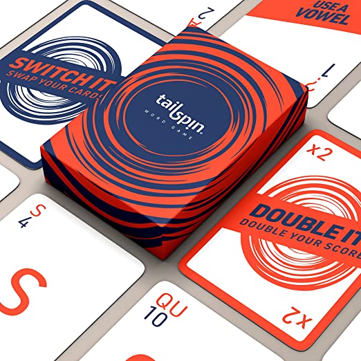 TailSpin Word Game is an exciting new word game suitable for all ages, with fun twists and turns and just the right mix of strategy, chance and intelligent word building! This fast-paced card game has a unique twist – you must make words with the ending letter/s of the word tail. And there are powerful Scorechanger Cards (Double It! Triple It! Split It!) and Gamechanger Action Cards (No Way! Ditch It! Switch It!) to make gameplay even more interesting!